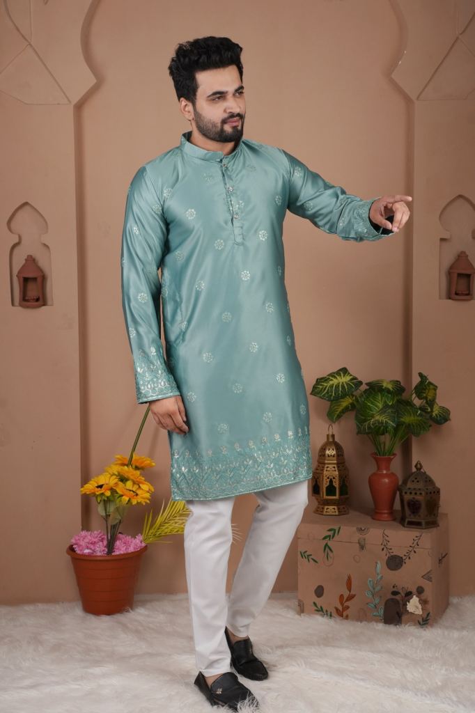 MALAI SILK WITH HEAVY EMBROIDERY SEQUENCE WORK KURTA Mens Kurta With Payjama