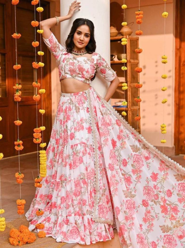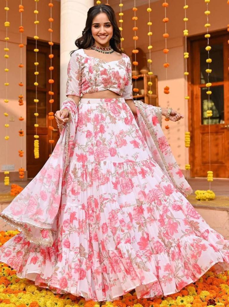 “Blooming Elegance in Step Flair with Designer Blouse & Lace-Trimmed Grace” *Price : 1399/-* *Color's : 1* Unveil your charm with this beautiful floral printed lehenga crafted with a stunning step flair design that flows gracefully with every move. The look is paired with a designer blouse with elegant sleeves, adding a touch of sophistication and modern appeal. To complete the ensemble, the dupata is adorned with fancy lace borders, bringing a perfect balance of tradition and contemporary fashion. Ideal for weddings, festive occasions, and celebrations, this outfit makes every moment shine with timeless beauty. *Blouse Fabric : Printed Georgette (Full Stitched)*