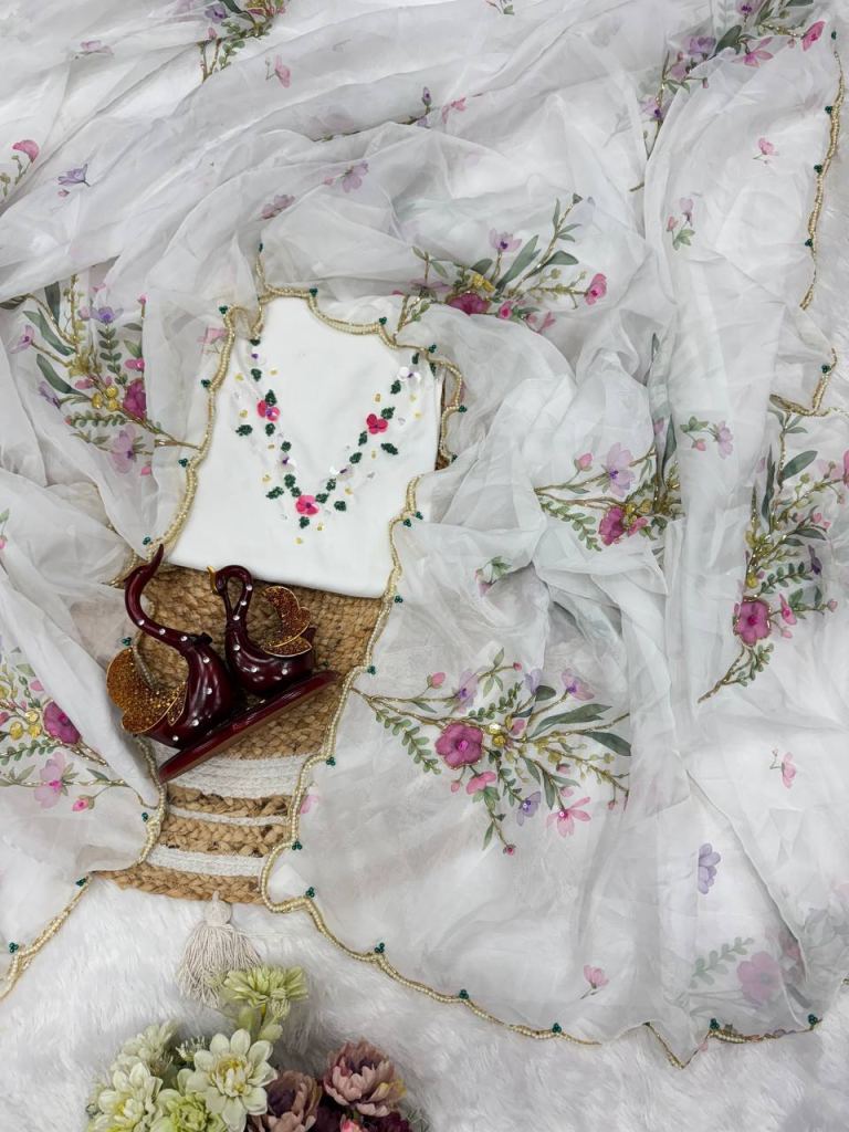 *Exuding grace and sophistication, this floral-printed organza saree blends classic beauty with modern elegance. Each delicate petal in the design tells a story of timeless charm, making it the perfect choice for those who appreciate both tradition and contemporary style.*